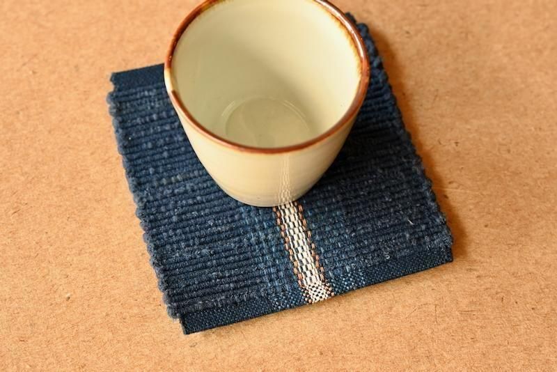 緯糸に、古い木綿の布を裂いたものを用い、織られたコースター。